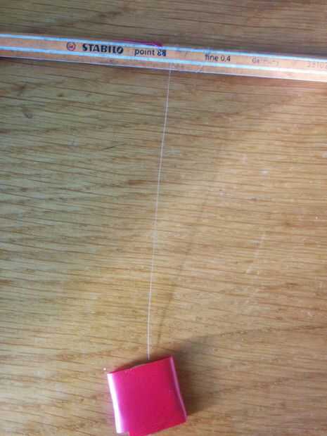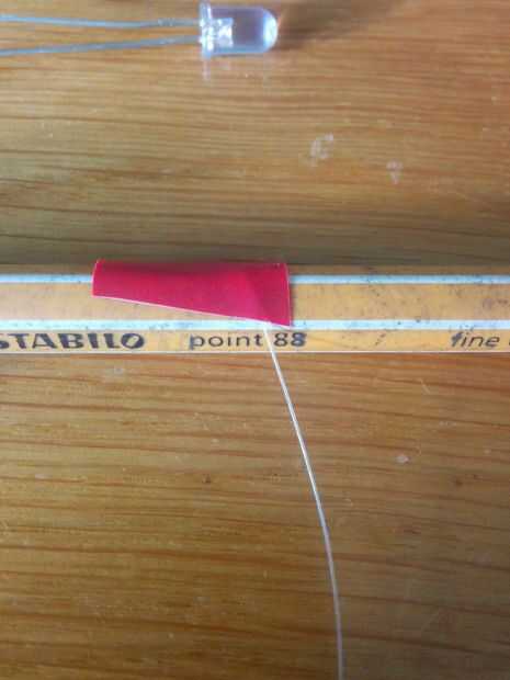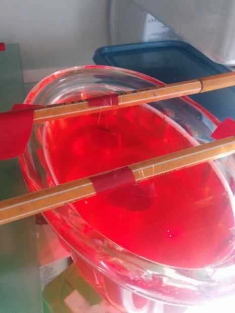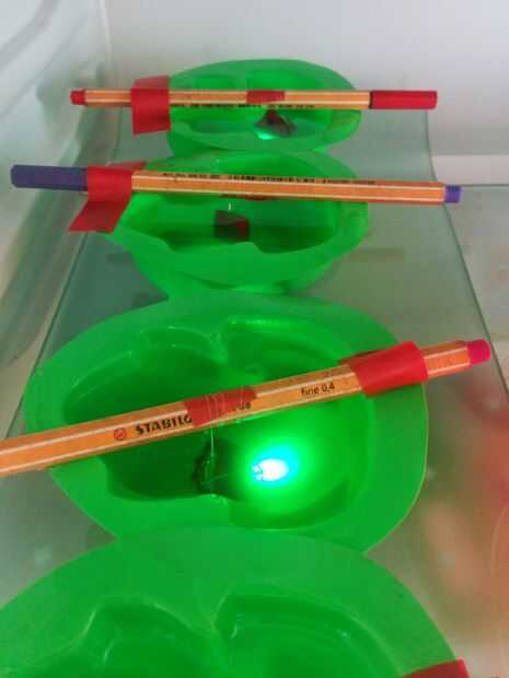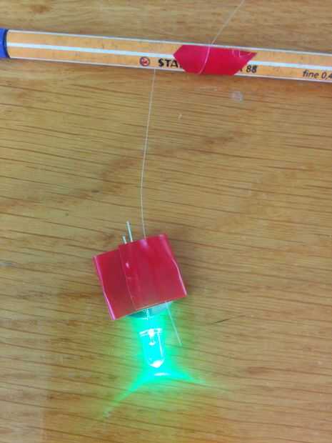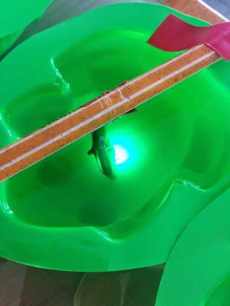 Mientras que la jalea está enfriando a temperatura ambiente con cinta un extremo de un trozo de 10 cm de cuerda de pesca a uno de los lápices o bolígrafos y el otro a uno de la batería. Hacer esto para todas las de LED y la batería. Una vez que la gelatina esté a temperatura ambiente Presione el LED a la batería se enciende y por lo que está apuntando hacia abajo. Colocar el LED en la gelatina por lo que se trata en el centro de la gelatina. Poner la gelatina en la nevera y espere.