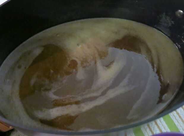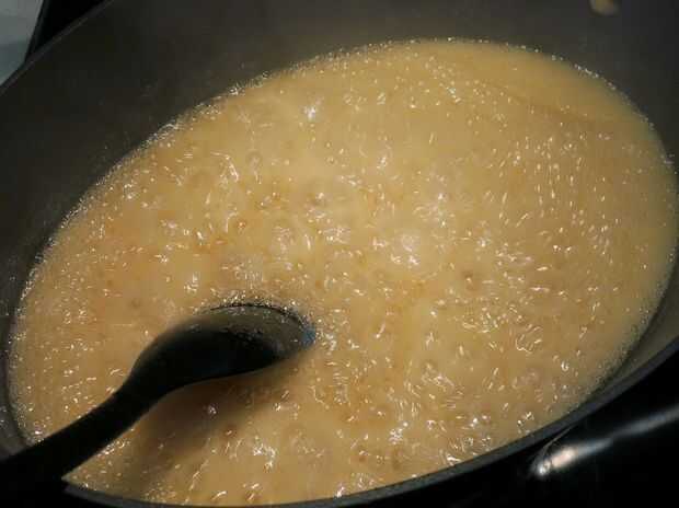 En la misma cacerola, mezcle el líquido 2 tazas coladas y el azúcar. Llevar a hervir todo a fuego alto, revolviendo constantemente. Rápidamente agregar pectina. Volver a hervir todo. Hervir duro durante 1 minuto, revolviendo constantemente. Retirar del fuego, capa superior de espuma con una cuchara de metal.