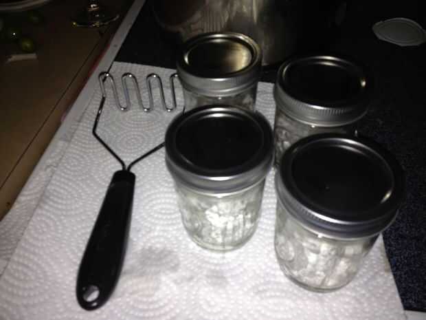 Yo desinfecte mi equipo mi olla a hervir y tirando todo 10 minutos, incluyendo los frascos. Cuando termine, tire pinzas fuera del agua por el extremo que queda asomando de la parte superior, retire sus artículos y dejarlos hacia fuera sobre una toalla de papel limpio y seco o un paño limpio y seco. Frascos deben colocarse vertical y se secarán por sí mismos mientras que la fruta se descompone.