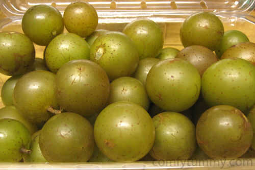 Muscadinias son uvas muy muy dulces, con un sabor más suave de regular uva de piel fina. Si usted no está familiarizado con ellos - normalmente sólo son estacionales y pueden generalmente solo se encuentra unas pocas semanas o meses al año. Muscadinias tienen una piel muy gruesa, que no es comestible en su forma cruda. Tienes que morder o cortar el extremo de cada uva para comer. Me gusta chupar la pulpa entera a mamar por unos segundos y luego trague entero, semillas y todo. Soy raro, lo sé.