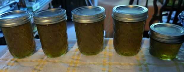 Utilizando diferentes colores de pimientos produce gelatina colores diferentes así, siempre es divertido ver cómo resulta. A veces la jalea es más verde, otros es más naranja o rojo. Las manchas de pimienta flotando en los colores hacen un hermoso mosaico en la jalea que me encanta sosteniendo a la luz del sol, igual que hice con el caleidoscopio de mi abuelo cuando yo era un niño. Aquí tengo fotos de dos tandas que hice, más verde, la otra naranja más. Ball dice que están bien añadir unas gotas de colorante de alimentos, pero me gusta dejar que la naturaleza manejar el color en este caso.