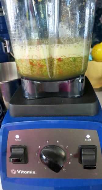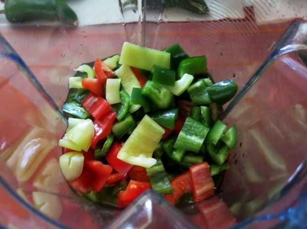 Puré de pimientos en procesador de alimentos o licuadora con 1 taza de vinagre de sidra hasta que quede suave. No haga esfuerzo puré.