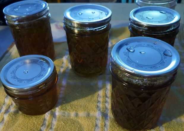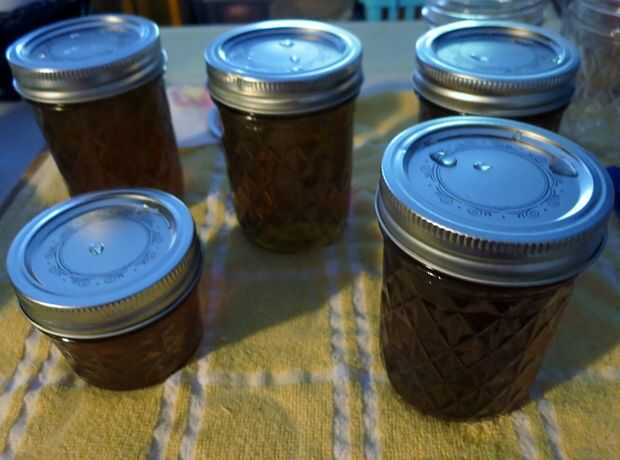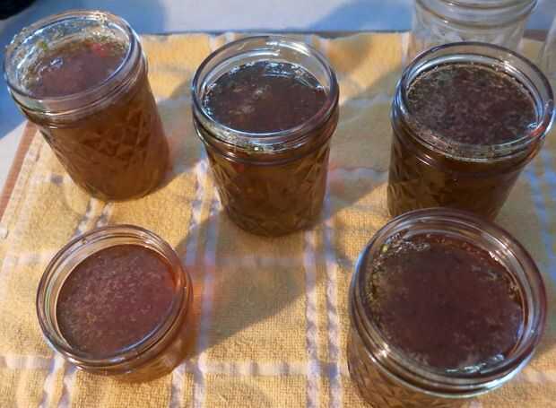 Vierte la jalea caliente en frascos dejando espacio libre de 1/4 de pulgada. Limpie el borde. Tapa de centro sobre la jarra. Aplicar banda hasta ajuste apretado de la yema del dedo. Procese en una olla de agua hirviendo durante 10 minutos, ajuste de altura, apagar el fuego y deje frascos en el agua durante 5 minutos. Eliminar recipientes y enfriar.