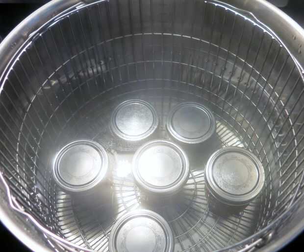 Preparar la olla de agua hirviendo. Frascos y tapas en simmering agua hasta que esté listo para el uso de calor. No hierva. Dejar de lado bandas.