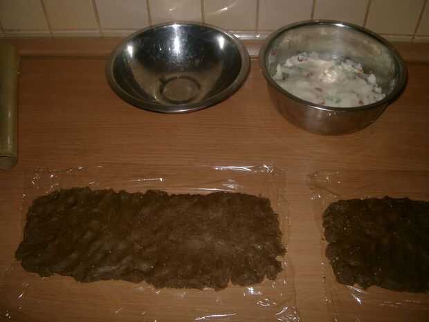 Dividir la masa oscura en dos piezas en plástico y rodillo cada uno... (tamaño 12 cm x 25 cm)