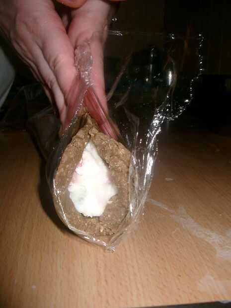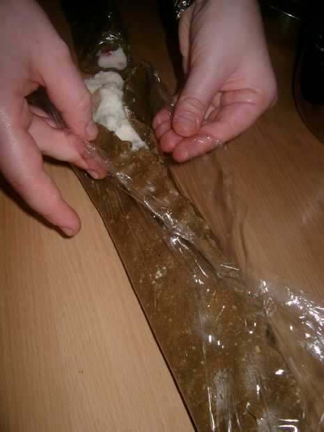 Con los dedos conectar dos bordes de la masa oscura (envoltura de plástico ayudará) que toma la forma de triangular toblerone chocolate...