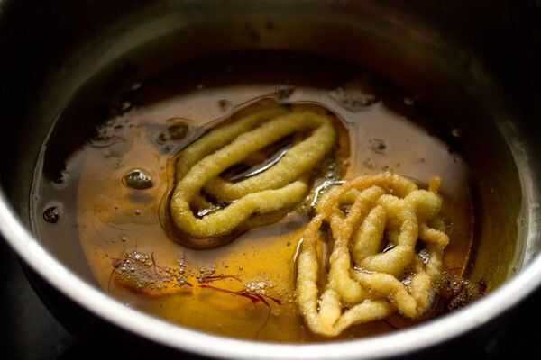 • Una vez que se llena la Manga pastelera, espirales de la pipa de la mezcla sobre un medio de aceite caliente, hasta llegar al menos 3 círculos concéntricos. Freír el jalebi a fuego medio hasta que estén doradas y crujientes. Una vez el jalebi es crujiente y dorada, drenar el exceso de aceite y sumergir inmediatamente el jalebi en el jarabe de azúcar caliente.