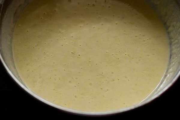 • Cuando termine, cubra la masa de jalebi y colocarlo en un lugar cálido durante 24 horas o durante la noche, hasta que se fermenta (la masa se elevará en la fermentación). Una vez que la masa se fermenta revuelva la mezcla en un corte y doble movimiento para combinar una vez más.
