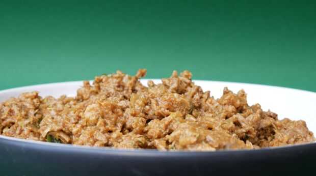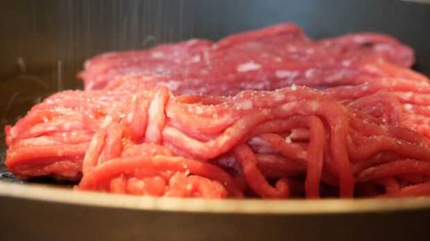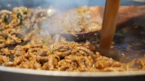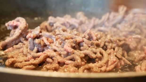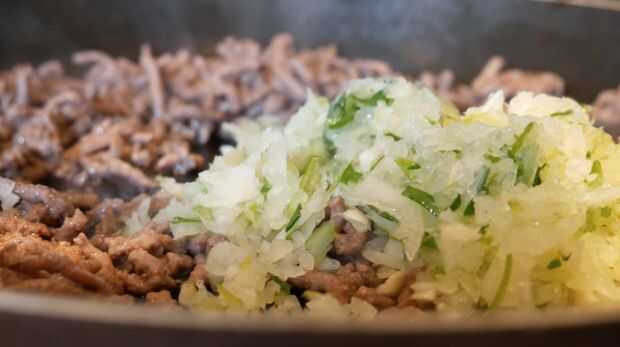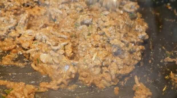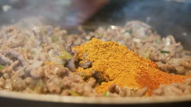 Sazonar la carne con sal y pimienta y brown a fuego medio. Escurrir el exceso de aceite y coloque en el calor. Cortar la cebolla y el ajo finamente y agregar a la carne y cocinar hasta que estén transparentes. Añadir las especias, seguidas por el caldo de carne y la salsa Worcestershire. Terminar añadiendo el pan rallado y dejar enfriar completamente.