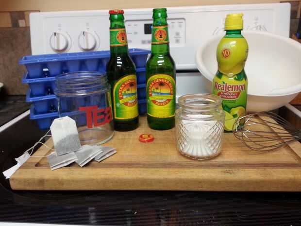Tomar de la botella de Ginger Ale y vierta en un recipiente. Le dan un buen bate para quitar la carbonatación. Puede omitir este paso si no te importa las burbujas de Co2 de congelación en la parte inferior de los cubos. Hace un patrón genial :)