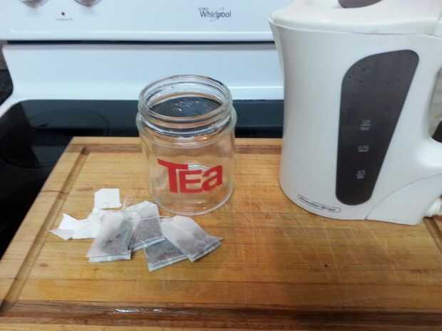 Esto tiene que ser fuerte porque sólo se compone 1/3 de la mezcla. Usé 4 bolsitas de té en 3 tazas de agua. Que preparar para 4-5 minutos, vaciar las bolsas de té (sin exprimirlos) y deje enfriar a temperatura ambiente antes de guardar en la nevera para enfriarlo más.