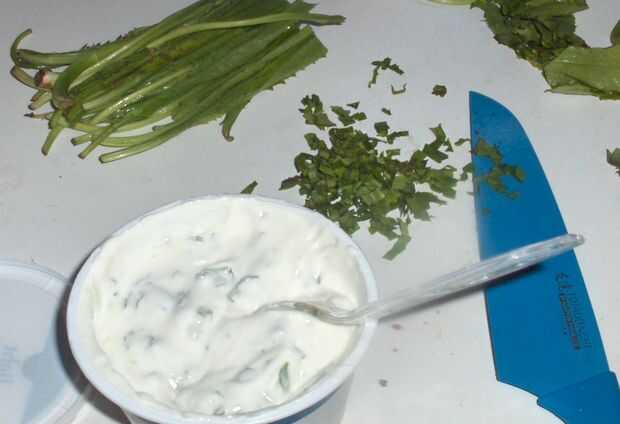 Culantro fresco picado y mezcla en crema, frutas y así sucesivamente todos los establecidos.