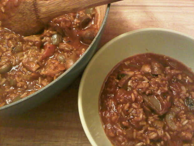 Jambalaya la mayoría comienza con algún tipo de carne pollo o carne de cerdo y salchicha de Andouille. Este es sin carne por lo que comienza con setas y la mantequilla. Después se plancha las setas se añade la Trinidad de verduras y luego una pizca de esto y una pizca de antes de añaden verduras y arroz. Se beneficia de un larga simmer y la comida de una olla se transforma en una comida muy sabrosa.