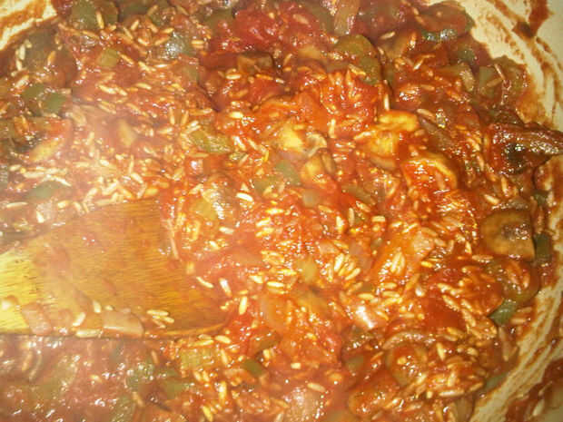 Añadir 1 lata pequeña tomate en jugo y pasta de tomate. Revolver hasta que la pasta de tomate es suave e incorporado. Agregar caldo de vegetal y especias y cocine hasta que la sopa llegue a hervir. Añadir arroz de grano largo y dejar la sopa a fuego lento bajo cubierta en unos 50 minutos o hasta que el arroz esté tierno. No mira el bote! Ir hacer otra cosa para que los bits de color marrón en la parte inferior de la olla se les permite pasar. Ahí es donde está la magia.