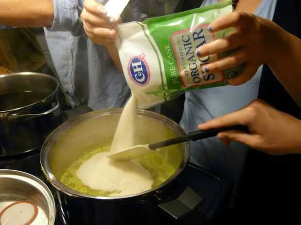Una vez que se alcanza plena ebullición añadir el azúcar y llevarla lentamente a un hervir revolviendo con frecuencia para evitar que se queme. Dejar en el agua hierva por unos minutos otra.
