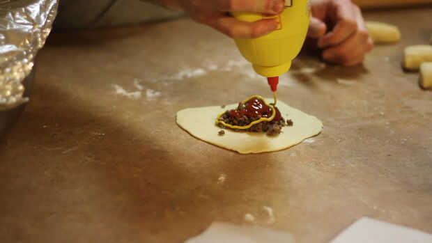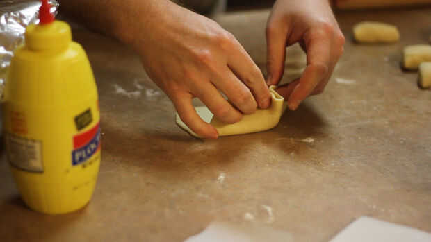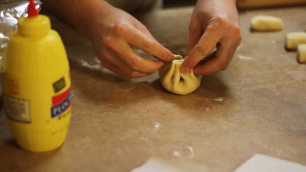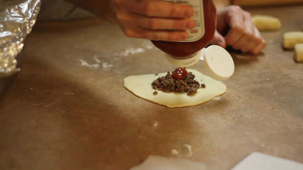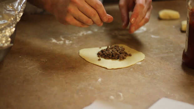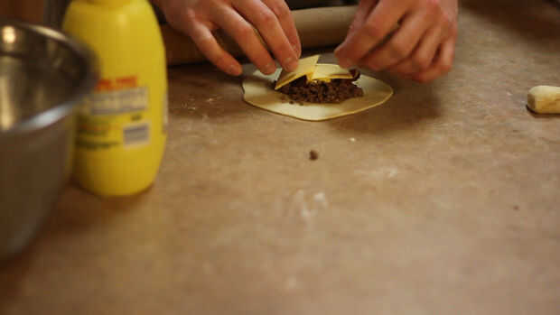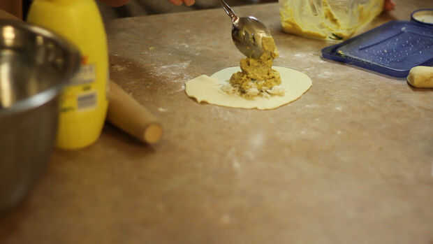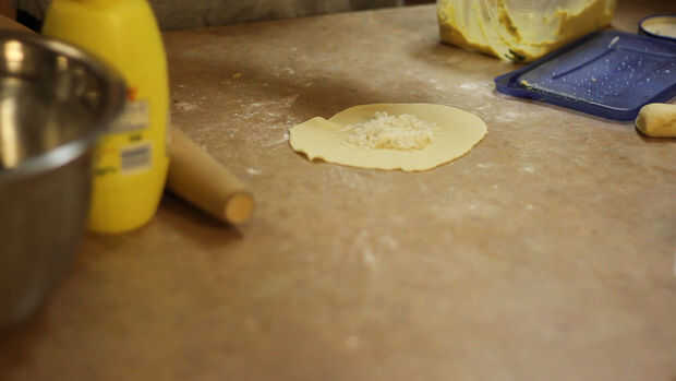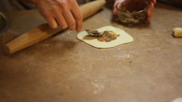 Una vez que tienes lo que quieres en la masa ir alrededor del borde, tirando de la masa hacia arriba y prensa juntos en la parte superior para hacer un lindo paquete.