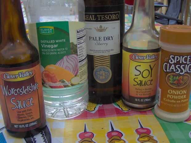 En un bol, combine 10 onzas botella de decir salsa, 1/2 taza de jerez seco, 1/2 taza de vinagre, 1/4 taza de salsa worcestershire, 3 ajo clavos a través de una prensa (o rompieron con el lado de un cuchillo y completamente picada) y 2 cucharadas de cebolla en polvo. Poner la marinada en el lado mientras que el hueso jamón picnic.