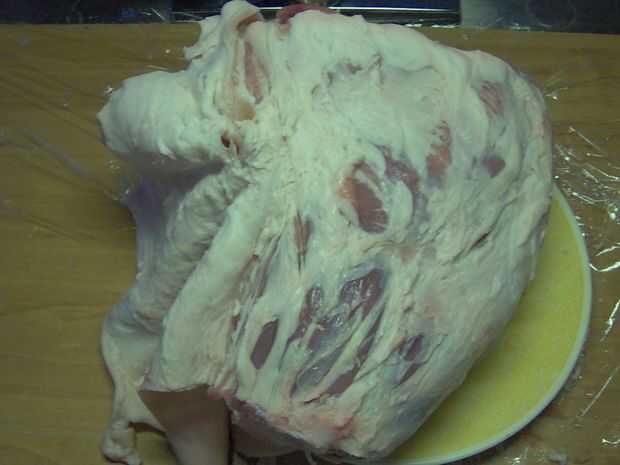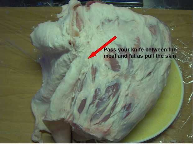 Será más fácil despegar la piel y la grasa tapa si el jamón está muy frío. Si no es así, ponerlo en el congelador durante 10 minutos o menos se "endurezca" la grasa. Por favor tenga mucho cuidado, y adultos solamente por favor. Un lado del jamón picnic se cubrirá casi por completo con una piel. Voltee el jamón y se encuentra que el otro lado tiene piel sólo unas cuantas pulgadas sobre el extremo fino del jamón. Este es el lugar para comenzar. Solo corte a través de la piel para comenzar. Asegúrese de que el cuchillo es agudo. Una vez que haga el corte inicial, cortar cuidadosamente entre la grasa y la carne para obtener un pedazo de piel retener. Más de corte, puede tirar de la piel y pasando el cuchillo en la zona entre la grasa y la carne. Al llegar al final, sólo el jamón y continuar. Trabajar lenta y cuidadosamente. Tardará un rato al iniciar esto. Cuando el hueso hacia fuera un par de jamones picnic recibirá más rápido