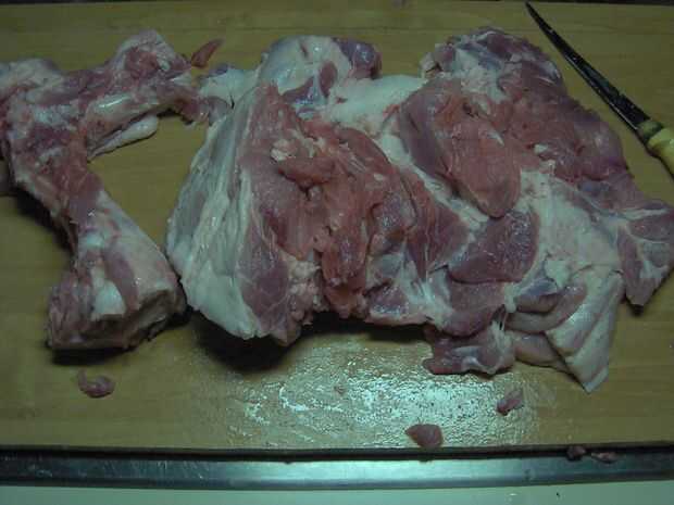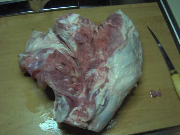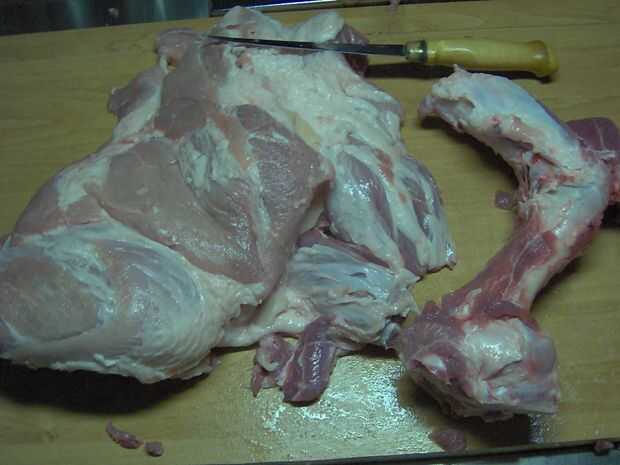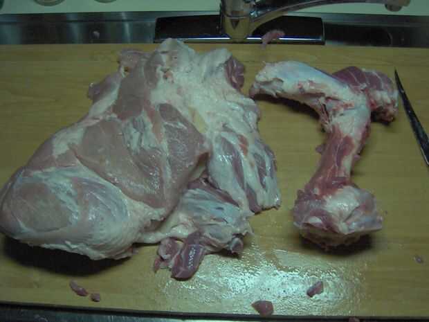 Comience en el extremo más grueso del jamón. Corte hacia abajo hasta llegar al hueso. Trabajar el cuchillo con cuidado a cada lado del hueso hasta que han tomado la carne lejos de las articulaciones en el extremo del jamón. Véase el siguiente cuadro. Utilice su cuchillo para encontrar el hueso y cortar a lo largo de ambos lados y luego separar la carne. Ten mucho cuidado. Si se corta en la carne no es gran cosa como usted será ser atarla para arriba después es marinado, pero si se corta a sí mismo...