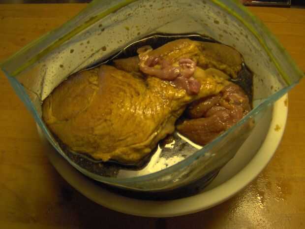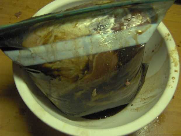Tomar el jamón deshuesado y ponerlo en una bolsa de congelador de gran tamaño. Coloque la bolsa en un recipiente que sostenerlo y vierta el adobo que puso en el lado anterior. Ponga el jamón en el refrigerador toda la noche preferiblemente 24 horas antes porque como ya he dicho un adobo mojado no absorbe cerca tanto o tan rápidamente como un masaje en seco que contiene sal. Podría preguntar entonces por qué marinar en todos. Frota seco realmente toma humedad de la carne whild adobos agregarlo. La razón para el tazón de fuente es que esta puede ser una operación complicada. Yo deliberadamente no limpie la marinada del recipiente o bolsa para mostrar la necesidad del tazón de fuente. Recuerde también, bolsos a veces derramar o abrirán y que sería un proyecto de limpieza.