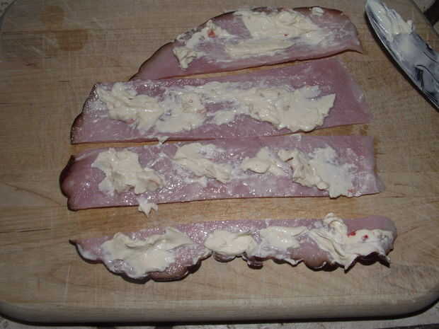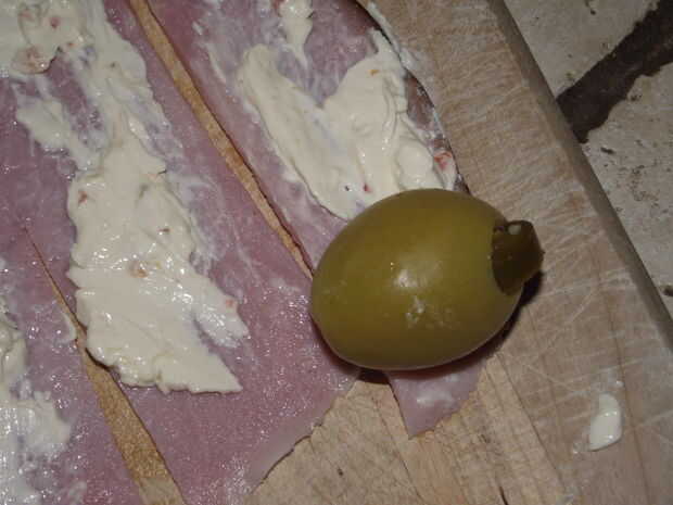 Primero usted tendrá que cortar el jamón en tiras lo suficientemente amplia como para sus aceitunas. Luego se extendió en algunos de los quesos crema. Por último poner una aceituna en cada tira y rodar para arriba y pegar una selección de diente en él.