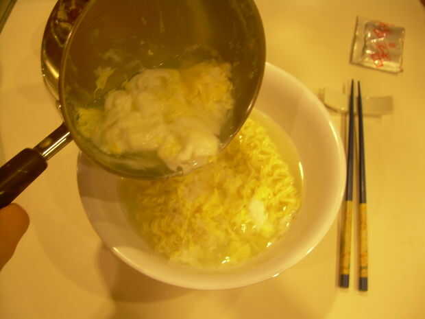 Como se puede ver en la imagen, vas verter los huevos y el agua que en cocinado en el recipiente con los fideos. No llego a esta conclusión hasta la tercera vez que cociné este plato en particular, así que tuve que vaciar toda el agua maravilloso de eggy hasta que el bowl no era desbordante.
