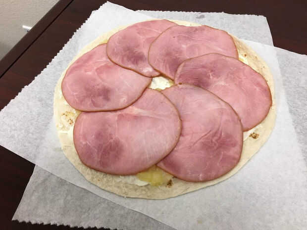Saque el jamón en rodajas finas del paquete. Seque cada rebanada con toalla de papel para eliminar el exceso de humedad. Capa de unas lonchas de jamón sobre la piña.