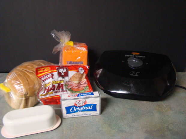 Fuentes: Pan (yo uso pan casero de trigo) Deli en rodajas, de jamón ahumado Queso de Tillamook cheddar mediano, rebanado Crema de queso Mantequilla Grill George Foreman (GF) (o una sartén y una estufa si no hav