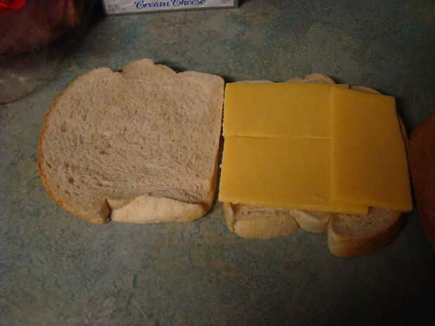 Por un lado (el segmento a la derecha) pone suficientes lonchas de queso Tillamook para cubrir el pan.