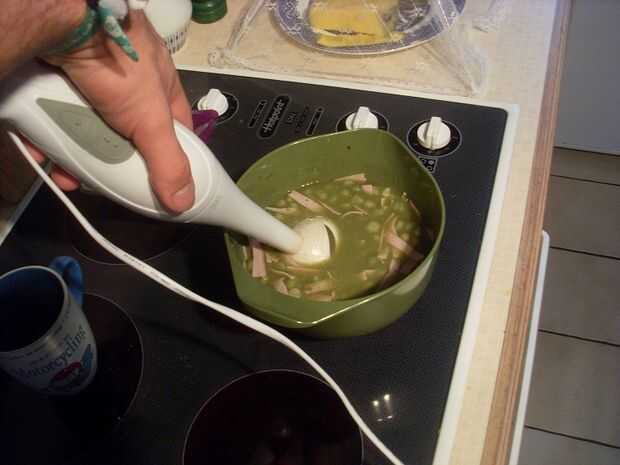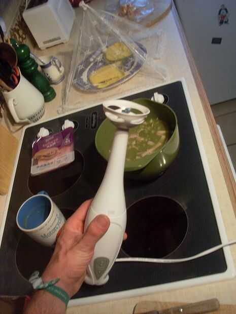 Si decides mezclar, he encontrado que el mejor enfoque es usar una batidora de mano. Mucho menos detergente para empezar! Y también tienes más control sobre cómo bien mezclado desea su sopa.