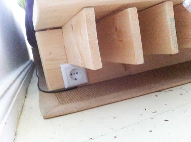 Hice 2 tomas dentro de mi cama porque no me gusta tener muchos cables en mi cama. Así que conecté el a tomas (uno para cada lado) y ahora sólo sólo cable conduce a mi cama.