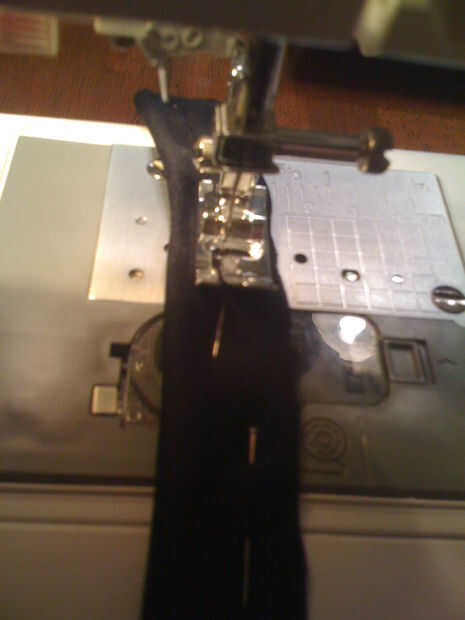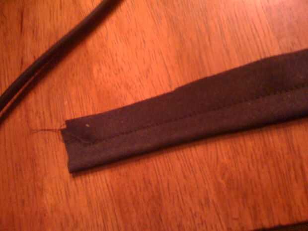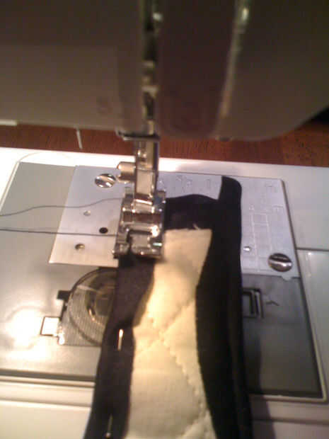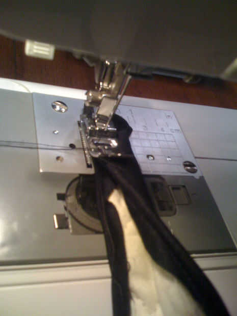Ahora vamos a empezar costura la tubería de la parte que va entre los dedos. Solo tome algunas de la tela, utilicé una pieza que era de un 1 1/2" a través y alrededor de 16" de largo, doblar por la mitad y comenzar a coser dejando la costura de 1/2" del borde doblado. Sólo recorte de tela sobrante para hacer más fácil el siguiente paso.