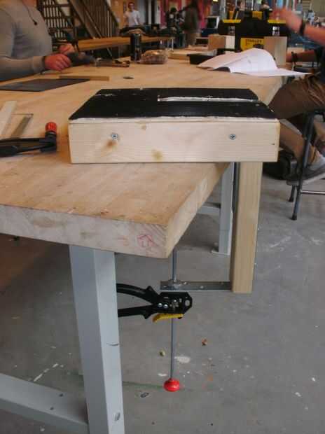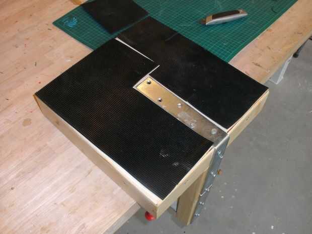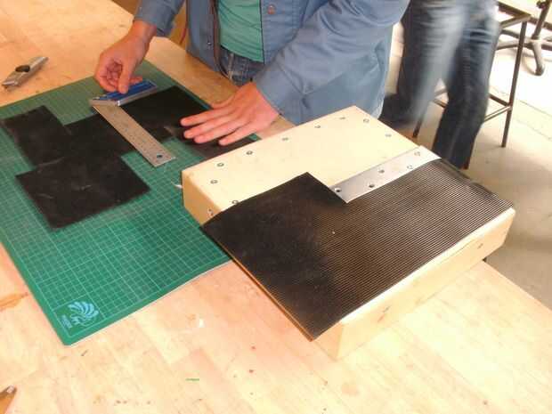 Fijar la jarra ayuda con una tabla de cierre de manera liberable y fácil (sin dañar, perforación,... la tabla), utilizamos este coche acanalado piso estera. Una ficha de este material se unirá a la ayuda con pegamento de la PU/construcción de madera y una lámina de este material se unirá a la mesa con la cinta de diseño. La textura acanalada de ambas capas encajan en unos de otros, por lo que se crea una conexión fuerte entre ambas partes. Tenga en cuenta que este paso es opcional, también son posibles otras fijaciones.