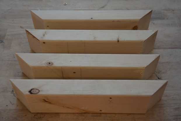 Las Cuatro vigas de lado (1.1) que tienen dimensiones 330 x 43 x 67 mm y un ángulo de 45 ° en ambos lados para unirlos luego. La operación de corte puede hacerse con principalmente cada herramienta de corte.