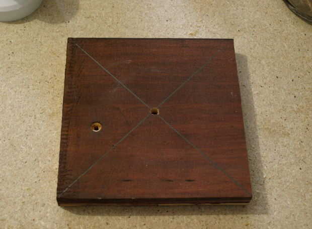 Una vez cortadas, encontrar el centro dibujando líneas diagonales desde las esquinas. Taladro de 5mm del agujero a través de todo el camino.