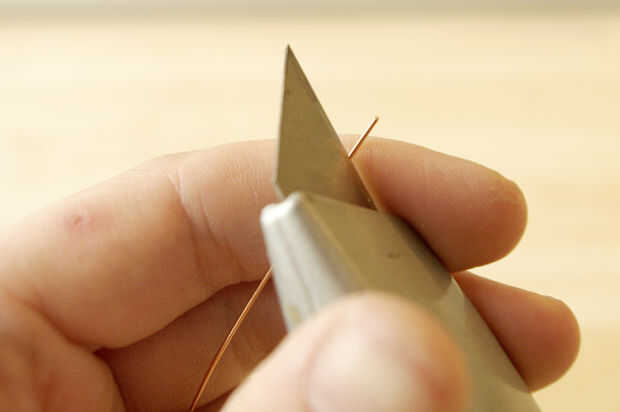 Tira a 1/2" de la capa de plástico de ambos extremos de dos 3" pedazos de alambre del imán con una hoja de afeitar.