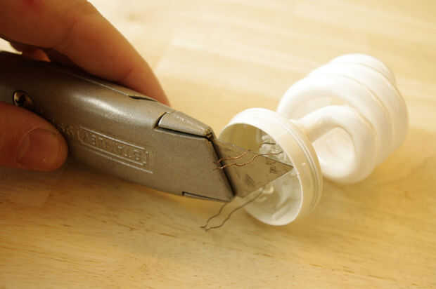 Raspe el recubrimiento de los cables que salen de la bombilla CFL con una cuchilla de afeitar.