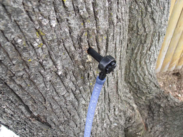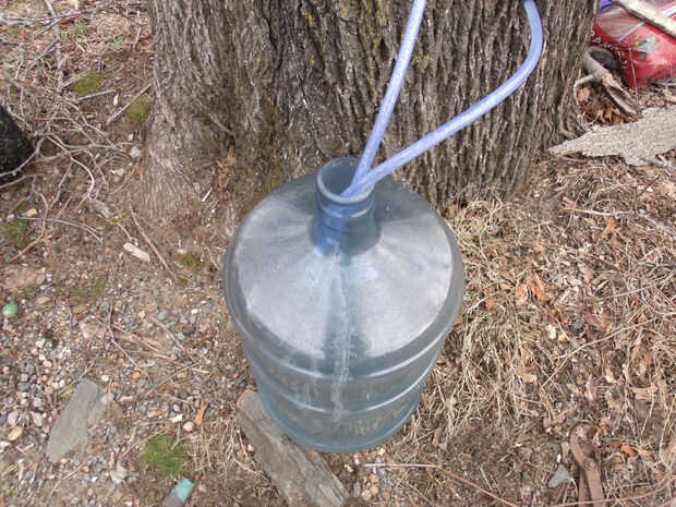 Las jarras de galón seis son fáciles de volver con una carretilla de mano o de mi hijo. También permiten un almacenamiento si tu horario no te permite hervir sap todos los días. Trato de no dejarlos ir por más de dos días. Puede explotar cualquier árbol de arce. Árboles de 12 a 20 pulgadas de diámetro pueden apoyar una toma, 21 a 27 apoyará dos grifos y árboles sobre 27 apoyará tres grifos. Los foto de arriba los grifos son diámetro de 5/16 de pulgada. Perforar en ángulo hacia arriba con dicho taladro de 5/16 sobre tres pulgadas más o menos en el árbol. Debería ver sap inmediatamente. Asegúrese de perforar a una altura donde las mangueras llegará a su contenedor.