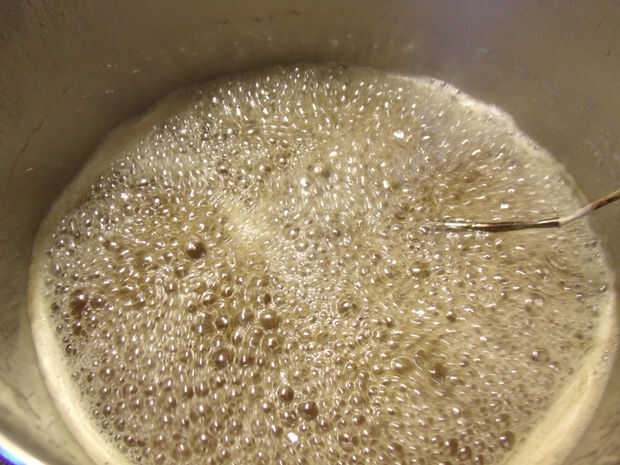 Así que aquí tengo un bote lleno de marrón buscando cosas burbujeante lejos a 212 grados. (214 en mi termómetro) Ahora espera mientras se reduce. Ya que reduce la temperatura empieza a elevarse por encima del punto de ebullición. Esto es donde es bueno tener un termómetro digital con alarma. Lo puse en 217 (219 en la mía) y ver reposiciones de la fiebre del oro. Puede hacer todo esto por el ojo con un poco de ensayo y error. Ayuda la experiencia. Hice todos los años último acabados por ojo. Como se obtiene cerca de 219,5 grados (221.5 en la mía, que comprar uno nuevo) las burbujas comenzará a construir en la sartén. Esto es donde no hay distracciones se debe existir.