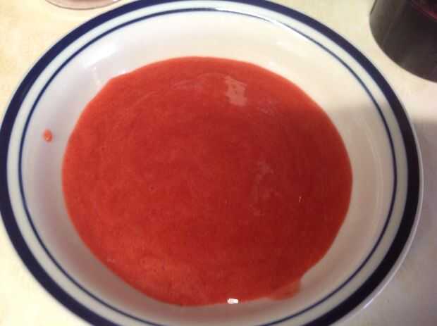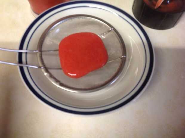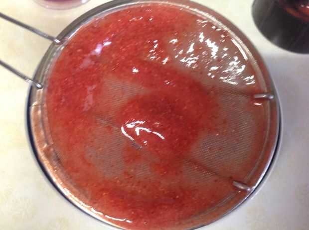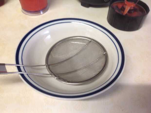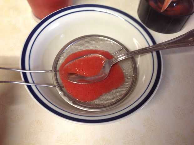 Necesita tener un tamiz. Estoy usando uno con los agujeros muy pequeños por lo que se pasa el líquido sólo. Verter algunos en el tamiz sobre un bol y con una cuchara, mezclar la pronto a ser jarabe de alrededor, no derrame de cualquiera de los lados. Mezclar en la parte inferior y alrededor y pronto, el jarabe empezará el goteo en la parte inferior. Hacer esto hasta que la salsa se ha ido. Desea hacer esto para asegurarse de que ninguno de los bits arenoso pequeñito de semillas no entrar en su jarabe.