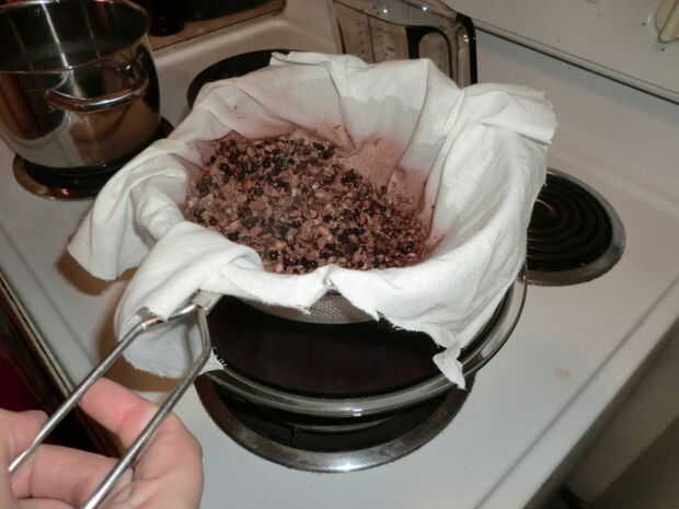 Vierta el líquido en el filtro. Sacar todas las hierbas en el colador. Enjuague la olla en este punto ya tendremos otra vez en un minuto. Deje la mezcla reposar un minuto para que el líquido pasa por el colador. Que establecer unos minutos enfriar, luego a la izquierda hasta los extremos de la tela y deje el goteo de líquidos. Gire el paño y exprima tanto del líquido como puedo conseguir de las hierbas. Recuerde: Esto es caliente y puede manchar su ropa. Si haces este paso, las manos convertirán colores por un día. Creo que el líquido de las hierbas es digno de este paso.