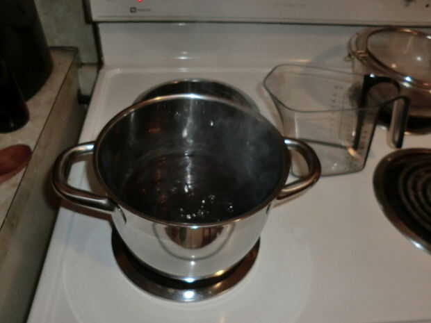 Mi olla tiene una línea en la parte que puedo usar para ver cuántas tazas de líquido tiene en el bote. Usé esto para mantener cualquier ojo sobre el nivel del líquido. Si no tienes una olla como ésta, puede usar la cuchara de madera que utiliza para mezclar el líquido. Ponga la manija en el líquido y la marca fueron el líquido fue a con una banda elástica. Luego se mide el líquido a medida que avanza. Después de hierve, puse en mi taza para ver cuánto tenía de medición de líquido. (No tienes que ser tan precisa como era. Yo soy sólo un stickler así.)