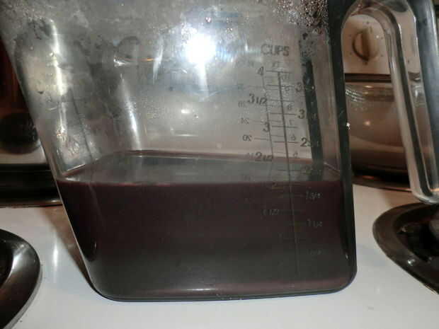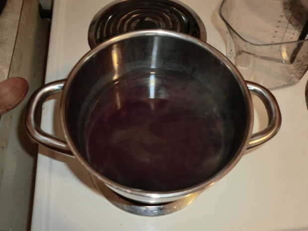 Después de recibir el maravilloso líquido púrpura oscuro, viértalo en la olla. Debe ser reducido. Toda el agua que ponemos en era necesario para extraer los nutrientes de las hierbas. Sin embargo, no necesitamos un regado abajo jarabe. Queremos que el jarabe más fuerte posible así que trabaja rápidamente. Yo medí otra vez antes de ponerlo en la olla. Tuve 6 tazas de líquido todavía. Me gusta reducir hasta un tercio, pero también lo podría hacer por medio. Desde que tuve 6 tazas, eso significa que quiero reducir hasta 2 tazas. Así que el líquido de nuevo en la olla y subir el calor para hacer hervir. Hervir, revolviendo ocasionalmente, hasta que se reduzca.
