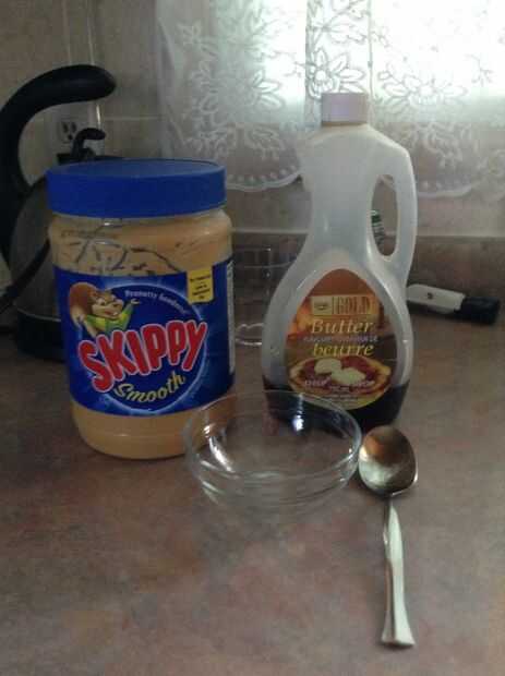 Necesita cualquier tipo de mantequilla de maní. Te recomiendo liso. Luego usted necesita jarabe de arce. Y también algo con y un recipiente.