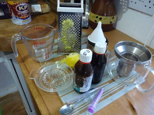Recuerde que estamos haciendo alrededor de 150 ml de medicamento para la tos y administrar a un máximo de 5 mill por dosis aunque 10 gotas de yodo parece mucho, cuando se administró es dividido por 5 molinos dan 32 dosis en 1 - 2 veces al día = 0.3 de una gota por dosis.