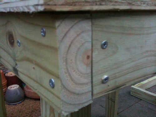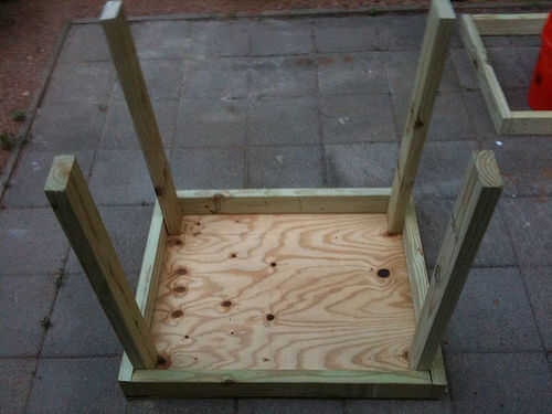 Con uno de los cuadros que creó en el paso 2, agregue un 38" 2 x 4 a cada esquina, lo que como Plaza y nivel como puede - pero sin destacar demasiado si no es exacta. Mi banco va en granito descompuesto, así que sé requerirá cierta nivelación una vez que he terminado.