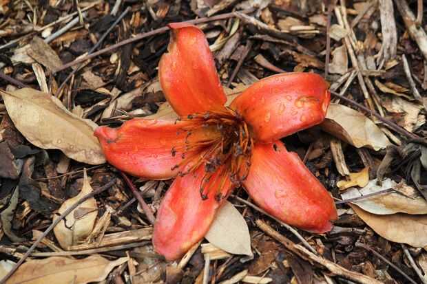 Explorando el Kampong, me encontré con una flor de Kapok pasó sobre el terreno, y pensamiento hizo una imagen muy agradable, con la lluvia rojo cera salpicada sale vestida como una estrella y los sépalos arruinados contra la hojarasca marrón: un retrato perfecto de una flor muere