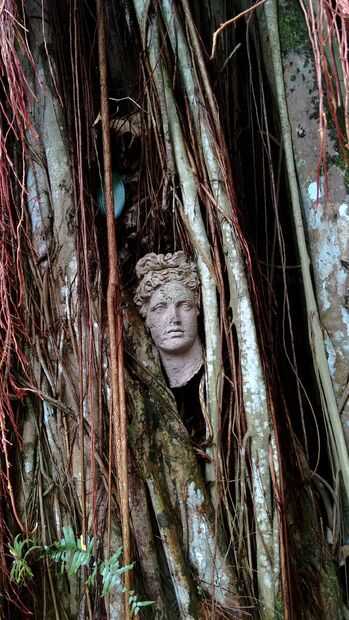 Otro hallazgo inesperado y agradable fue el busto de una estatua antigua, enclavada en los mechones chungo de un árbol de ficus.