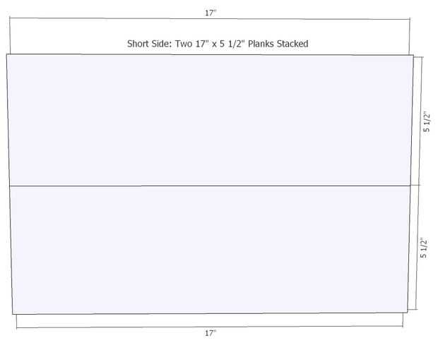 A continuación vas a tomar uno de sus tableros de dos cerca restantes y cortar en cuatro tableros de 17″, que servirán como sus lados cortos. Asegúrese de cortar las tablas de 17″ uno a la vez y marque siguiente después de cada corte, haga una marca cada 17″ y corte a la vez como este no se cuenta la madera perdida como resultado del corte (espesor de la lámina). Establecer estas placas a un lado con los últimos cortes. Usted no necesitará el resto ~ 3 pieza, puedes tirarlo.