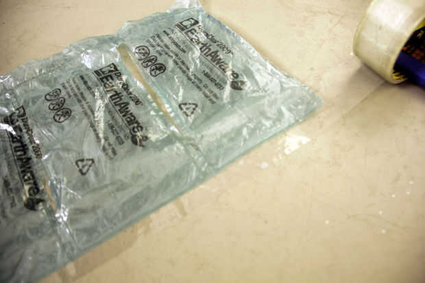 Inicio por el despliegue de su cinta de embalaje transparente para que el lado adhesivo quede hacia arriba; desea una longitud igual o superior a la columna de almohadas de aire. Coloque la columna de almohadas de aire para que el borde del plástico reúne en el centro de la cinta de embalaje, como se muestra en la imagen. Corte la cinta muy bien al final del aire almohadas de modo que no es visible o unas pocas pulgadas / 10cm desde el extremo de la columna de modo que usted puede utilizar la ficha de toque como un dispositivo de suspensión. Para un jardín vertical cubierto no necesita cortar la almohada de aire del centro.